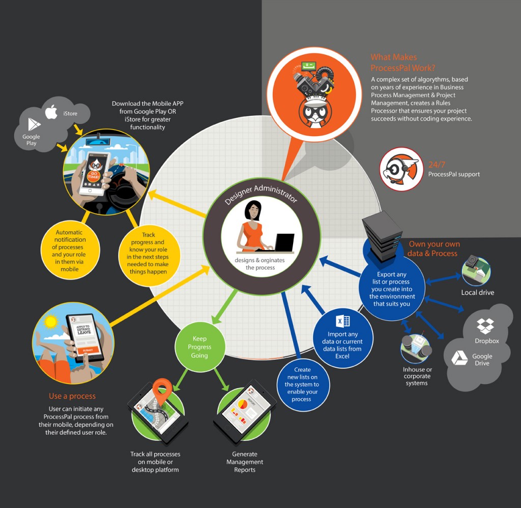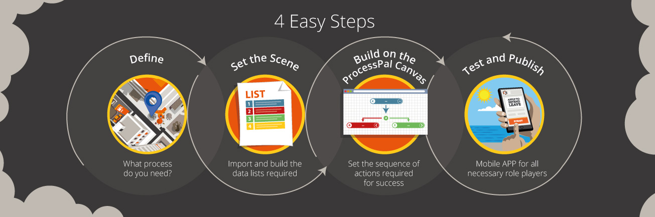 Design an App using our unique Application Behavior Model to develop an App needed in your business (for eg. leave application, sales to delivery, customer management, timesheet and expense claims) or a personal App (for eg. wedding, anniversary, relocation). Invite all participants to your App through the ProcessPal Designer and track the progress to successfully reach your goals.